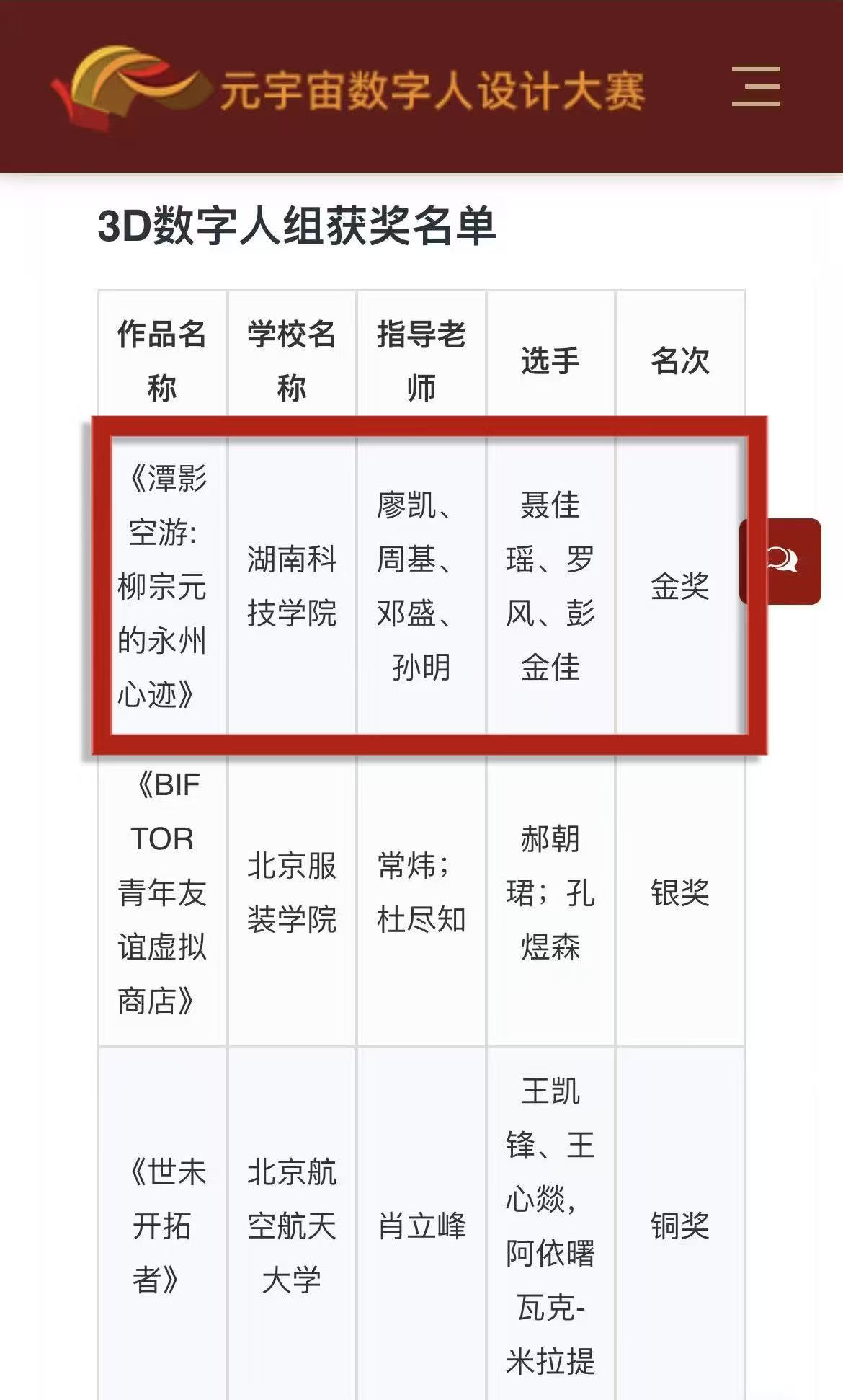 本网讯(通讯员 王星怡)近日,2025年全国大学生计算机应用能力与数字素养大赛落幕,我校土木与环境工程学院智能建造系参赛团队依托砖石质文物智慧化保护利用技术湖南省重点实验室,凭借原创作品《潭影空游:柳宗元的永州心迹》从全国众多参赛队伍中脱颖而出,成功摘得元宇宙数字人设计赛道3D数字人组金奖。