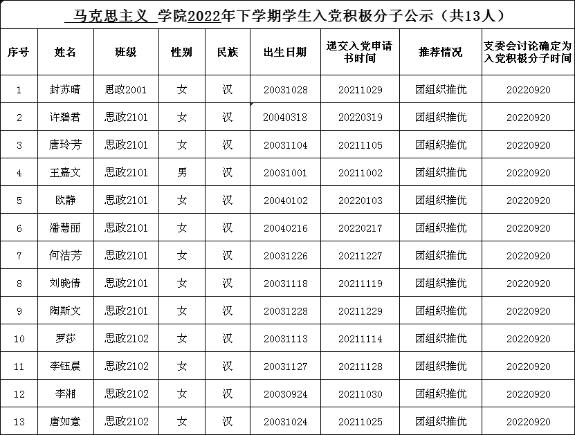 经党支部培养教育和考察,在听取培养联系人、党员和群众意见的基础上,经支委会2022年9月22日上午召开会议讨论,拟确定封苏晴等十三名同志列为入党积极分子,报学院党总支审查。
