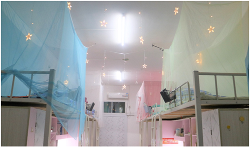 别具创意的装饰、整洁干净的环境、温馨和谐的氛围,该院各寝室团结协作,打造了一个又一个特色寝室。有的将自己的照片贴在墙上作为装饰,有的用手工折纸做成小饰品,有的用气球装扮天花板,风格各异。其中,荷二303寝室以温馨淡雅为主题,打造了可爱俏皮的气球天花板,在暖黄色的墙上贴上山形的贴纸,勉励自己要像山一样坚韧挺拔。荷二208寝室“绿萝苑”以蓝色为主色调,寓意室友们要像海洋天空一样宽广,相互包容、和睦共处。