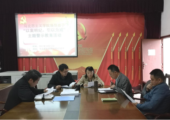 本网讯(记者吴祖琳)日前,马克思主义学院领导班子“以案明纪,引以为戒”主题警示教育活动在鹤鸣楼405会议室举行。马克思主义学院院长廖雅琴主持会议,党总支书记郑向晖、副院长杨军、党总支副书记兼副院长高丹、副院长李定坤出席会议。