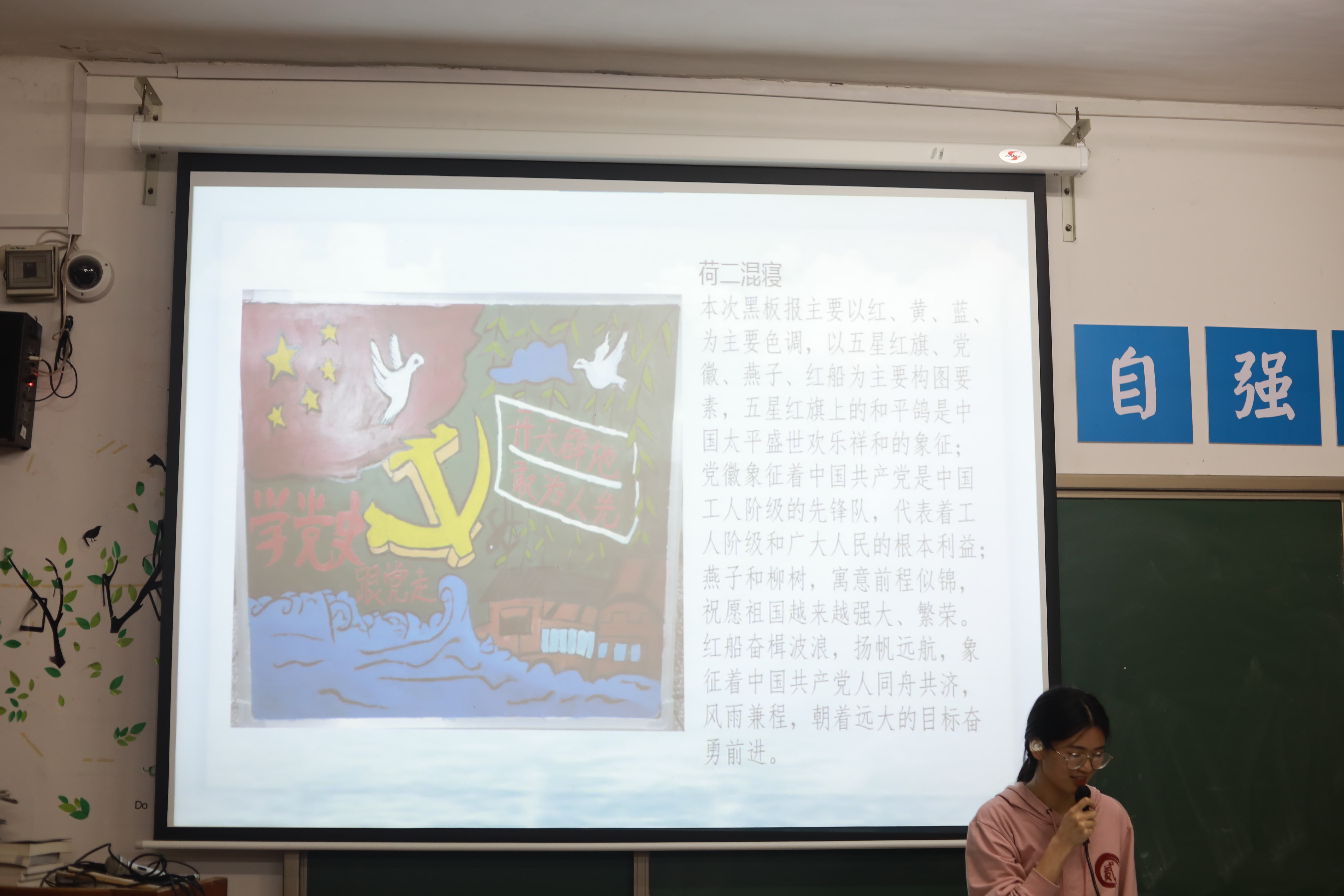 在比赛中,各个参赛寝室依次上台展示参赛作品。其中,松四107寝室的黑板报作品以革命红为基调,醒目的镰刀与锤头,是对党最衷心的歌颂;荷二309寝室板报左上角的红色数字“一百”和黄色党徽体现了本次活动的主题;荷二混寝的黑板报以党徽、燕子、红船为主要素,象征着中国共产党的先锋队地位以及中国共产党不忘初心,牢记使命。