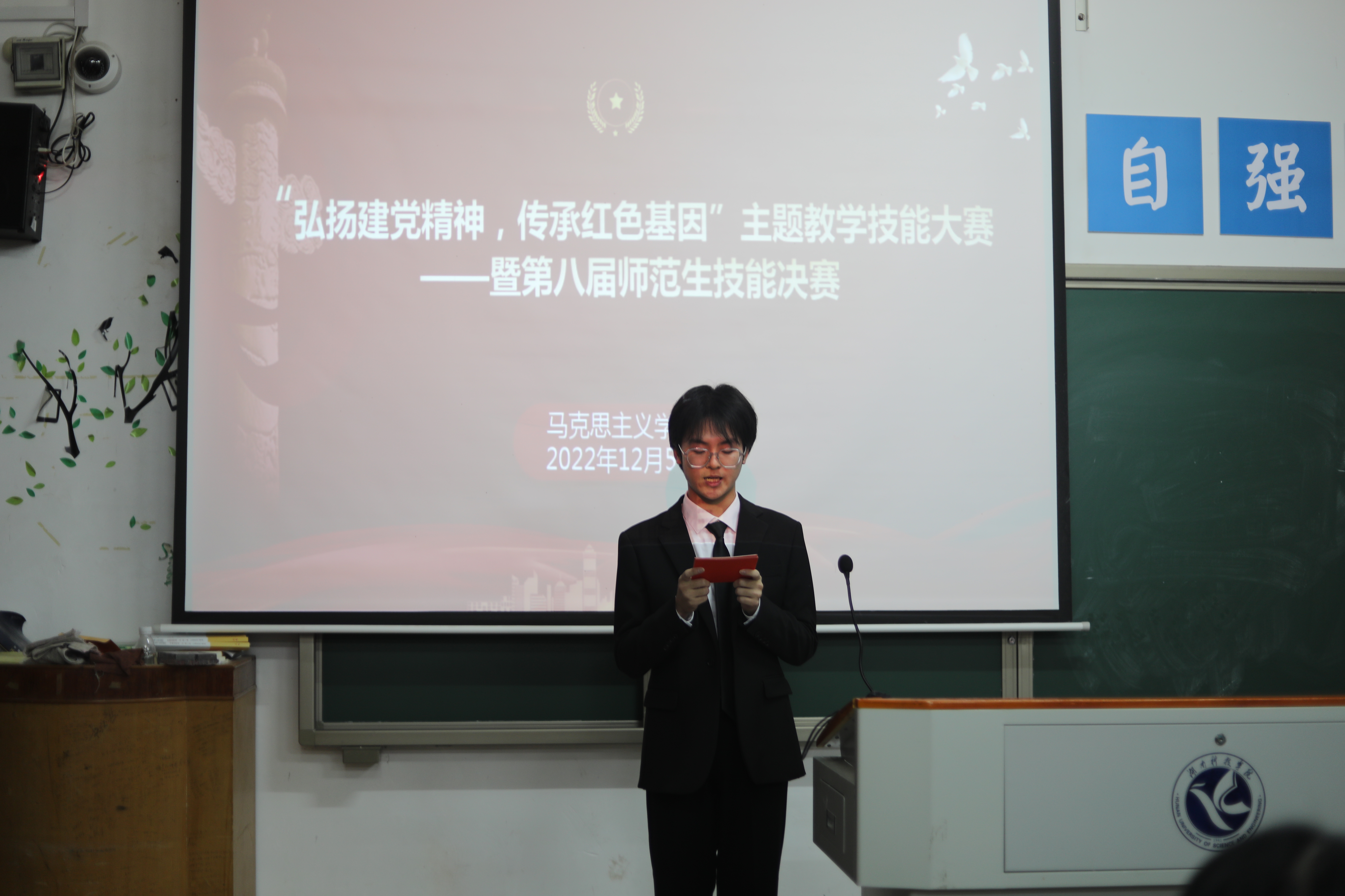 本网讯(记者 姚茹)为深入学习党的二十大精神,弘扬伟大建党精神,提升思想政治教育专业学生专业素质。12月5日晚,马克思主义学院于鹤鸣楼501教室举办“弘扬建党精神,传承红色基因”学习党的二十大精神主题教学技能大赛。