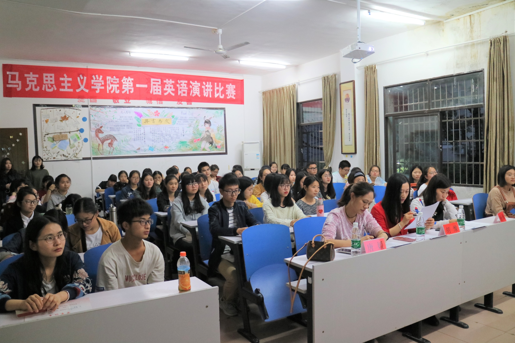 本网讯(通讯员 张亚娟)为迎接第24届全省大学生英语演讲比赛,提高我院学生的英语水平及增强英语学习能力。马克思主义学院于4月27日晚在鹤鸣楼501教室举办英语演讲比赛,外国语学院胡维老师、杨梅老师、唐媛老师担任评委,16级、17级学生参与。