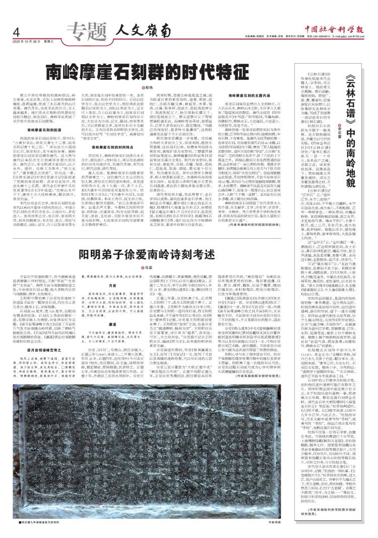 本网讯 《中国社会科学报》“人文岭南”专版10月28日整版刊登了我校国学院摩崖石刻研究团队的三篇文章,包括“摩崖碑拓”课程专任讲师敖炼的《南岭摩崖石刻群的时代特征》,图书馆副研究馆员李花蕾的《〈云林石谱〉中的南岭地貌》,国学院特聘教授、湖南图书馆研究馆员寻霖的《阳明弟子徐爱南岭诗刻考述》。