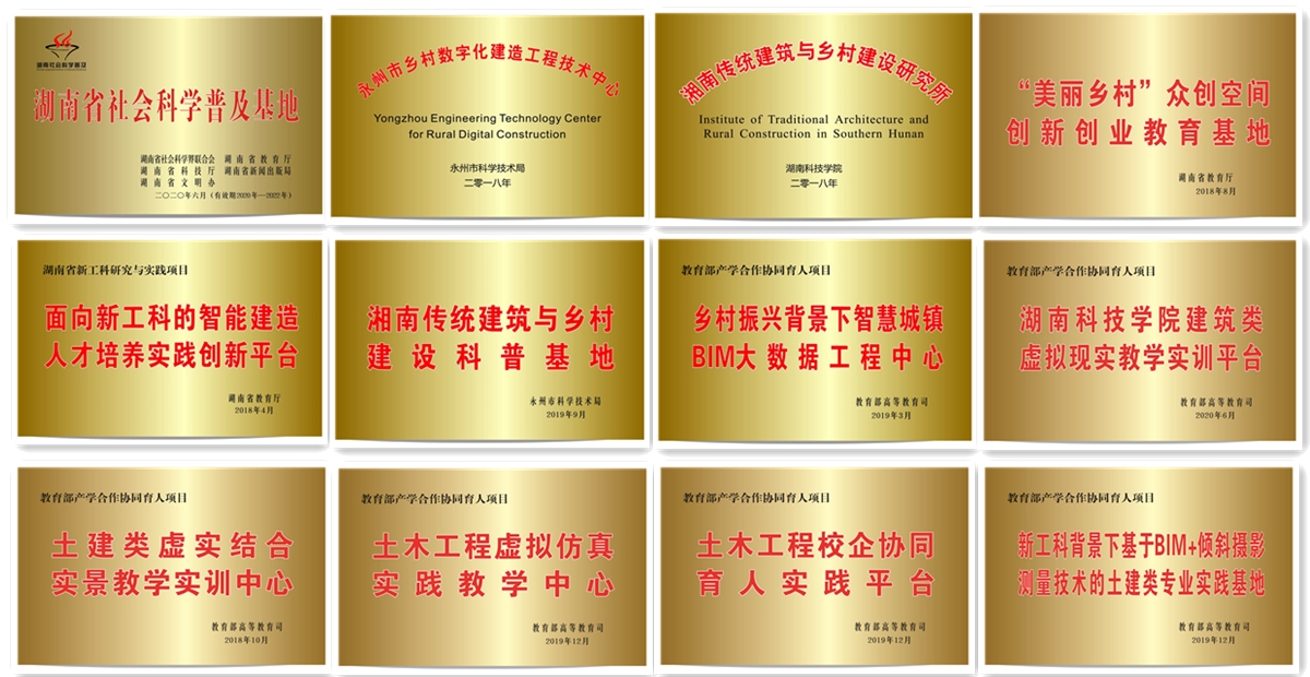 学院现有各类仪器设备价值一千余万元,包括探地雷达测试系统、飞马无人机、大疆无人机、法如三维激光扫描仪、GPS接收机、微机屏显式液压万能试验机等设备。拥有湖南省古建筑文化遗产保护传承社会科学普及基地、湖南省优秀校外实习基地、湖南省校企合作“美丽乡村”众创空间创新创业教育基地等多个省级实践教学基地,拥有BIM技术研发中心、开云最新版本app下载湘南传统建筑与乡村建设研究所、永州市“乡村数字化建造工程技术中心”、永州市“湘南传统建筑科普基地”以及教育部协同育人“乡村振兴背景下智慧城镇BIM大数据工程中心”等实践中心。学院注重与社会多方合作办学、协同育人,与中铁、中交以及湖南建工集团等企业签署了校企合作协议;先后与广州、深圳、长沙、杭州多家知名企业建立校外实习基地、创客中心等人才培养基地。