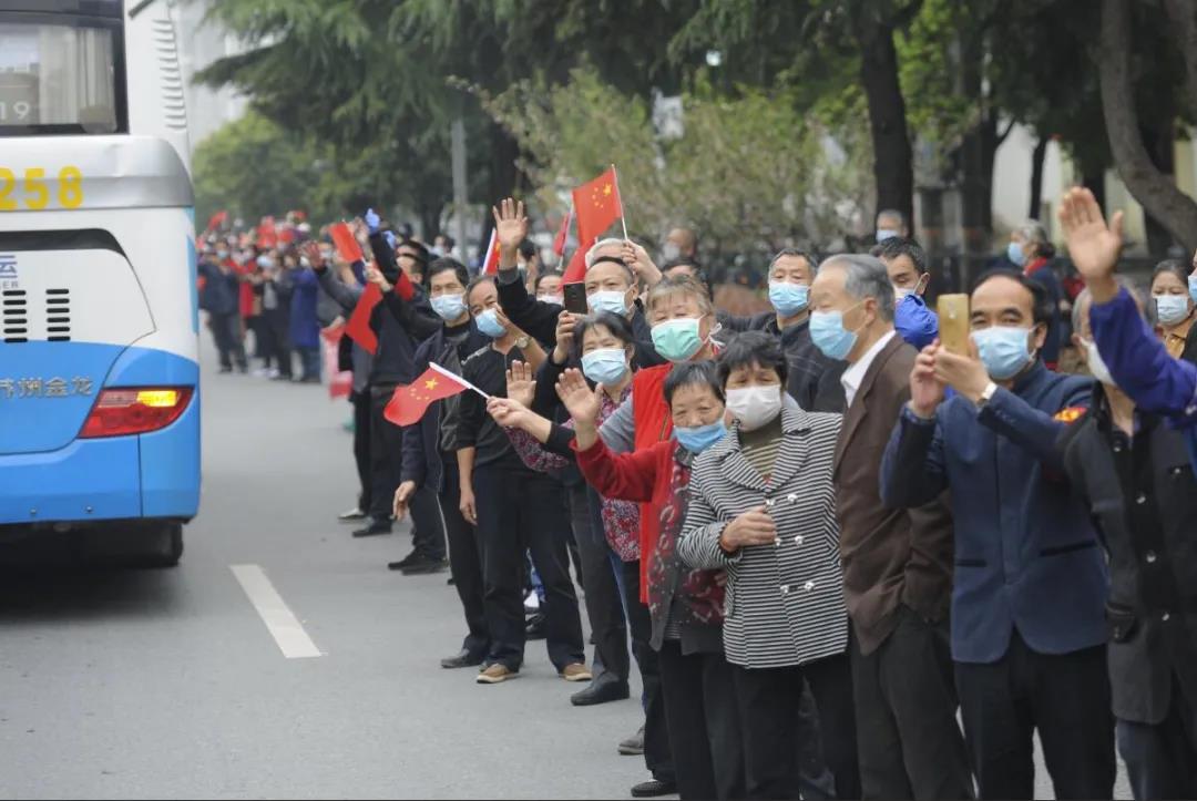 3月22日,湖北省黄冈市黄州区,市民自发地在黄州大道两边给湖南支援黄冈医疗队送行。送行队伍十三公里,一直延续到高速路口。