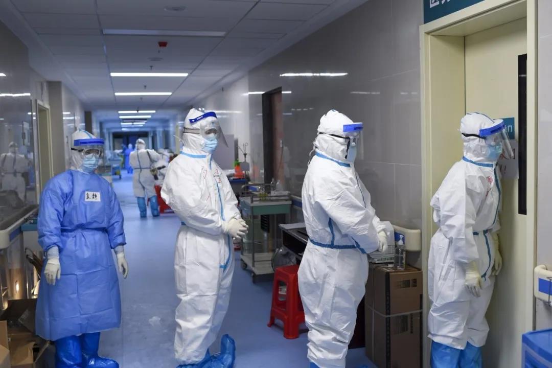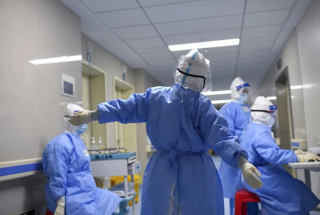 3月4日凌晨1时许,湖北省黄冈市大别山区域医疗中心,下班的医护人员排队准备进入缓冲间。从病房进入清洁区,必须经过三个缓冲间,在第一个缓冲间脱掉最外层防护服、手套和脚套,第二个缓冲间脱掉里层防护服,第三个缓冲间更换口罩。走到清洁区后,还需要全身喷洒酒精消毒。