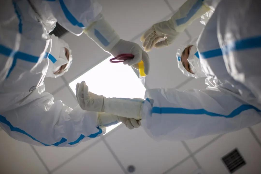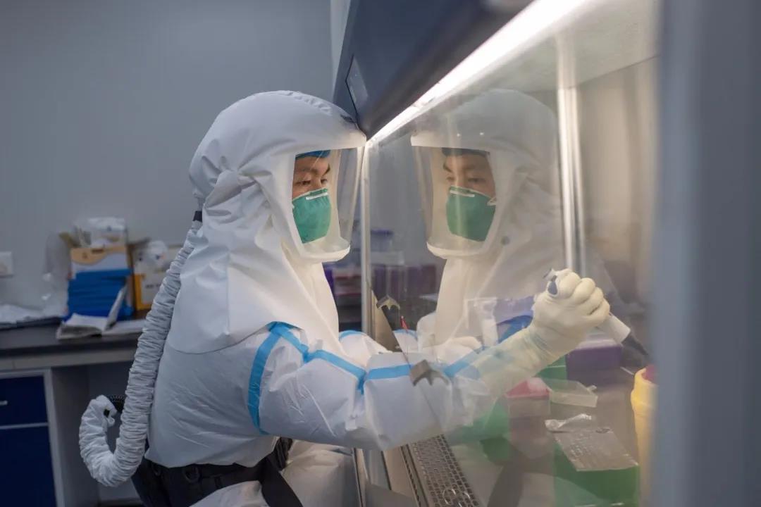 3月2日,湖南支援黄冈医疗队流调检测队队员曹宇航在生物安全柜内进行核酸提取。这里是离病毒最近、感染风险最大的地方。每天送往黄冈疾控中心的样本,主要来自于黄州区,以及其他不具备检测条件的县市,少则600份,顶峰时超过1200份。