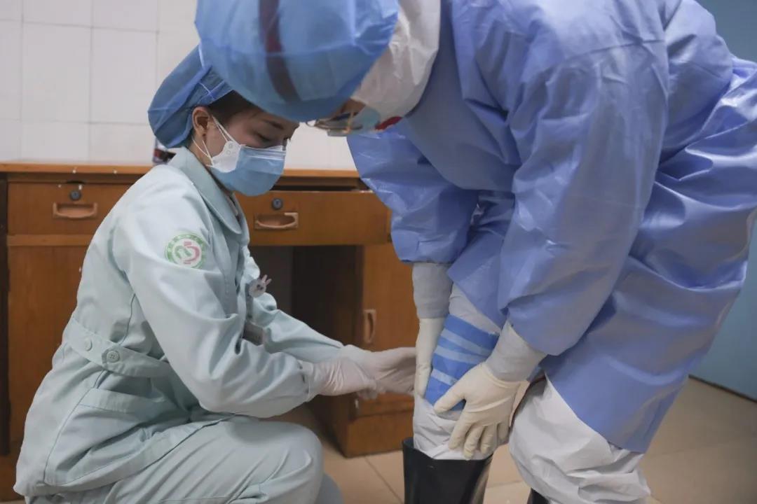 2月4日凌晨2:10,湖南省娄底市中心医院,23岁护士陈静(右)和同事用头套和胶带给防护服打”补丁“。刚把转诊病的人房间打扫、消毒,又给新来的病人打针、查房后,她实在忍不住想上厕所,看到防护服膝盖位置磕破一个小洞,她和同事给防护服打了个“补丁”,然后继续工作。出了隔离病房再进去就必须重新进行防护。“实在不忍心把防护服丢掉,之前我们只有隔离服,现在有了防护服大家都特别珍惜”,陈静说。