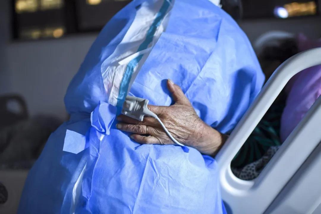 3月4日凌晨2时,湖北省黄冈市大别山区域医疗中心,一名重症老人用左手紧紧抱住护士樊柯麟,很吃力地说:“你别走,陪我聊聊天。”