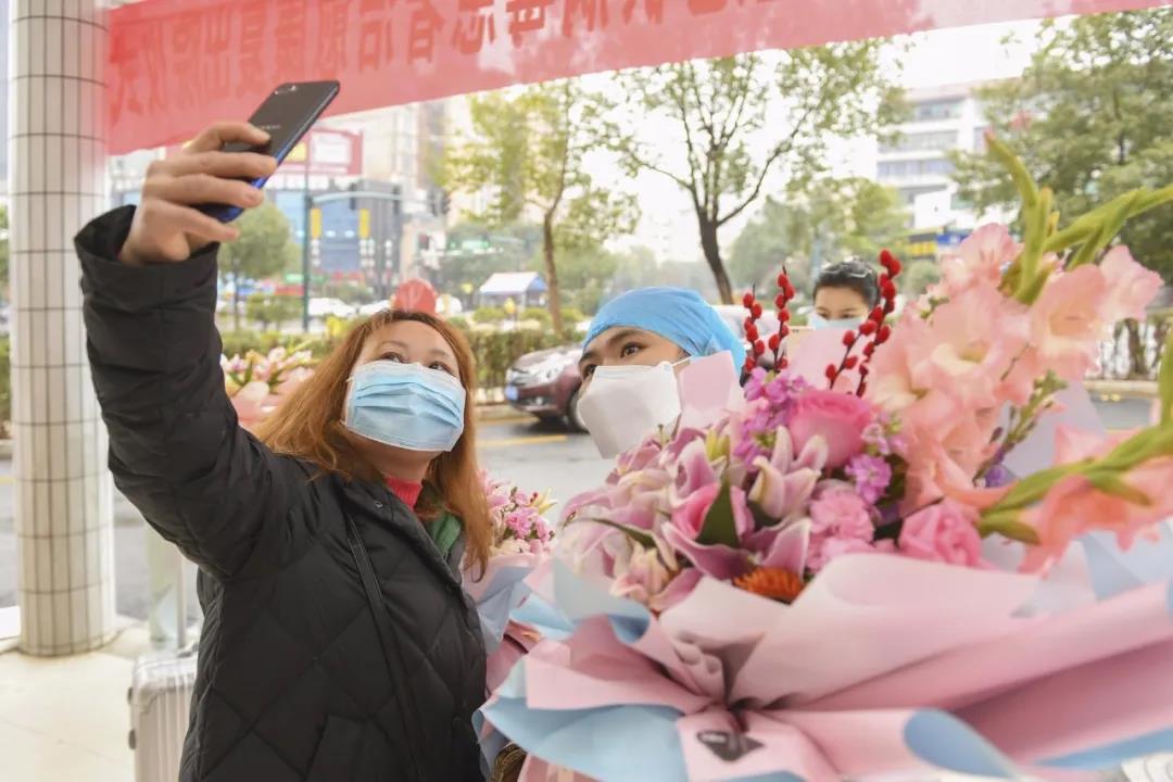 2月3日,湖南省娄底市中心医院,该院第一例新冠肺炎确诊患者张女士顺利出院。出院仪式结束后,张女士举起手机与护士自拍留念。43岁的张女士在武汉当快递员,回湖南老家过年后感觉身体不适,不久被确诊。