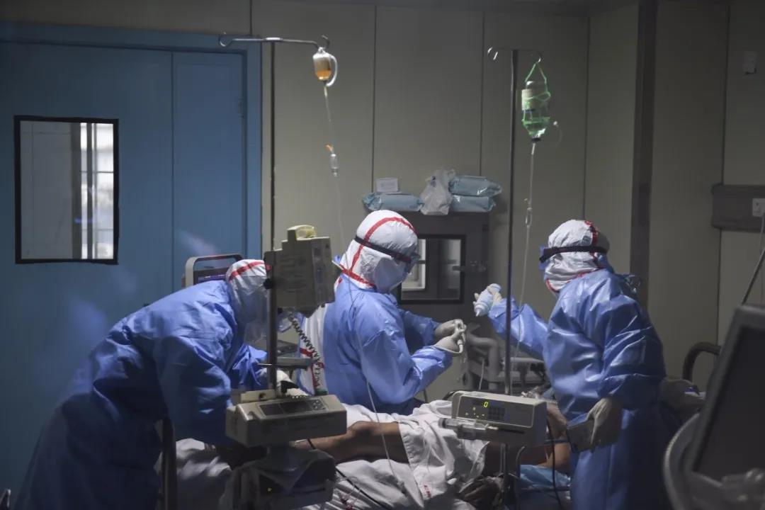 2月3日15:50,湖南省娄底市中心医院,医护人员在负压病房内对重症病人刘某进行抢救。经过3个半小时的全力抢救,病人终于转危为安。