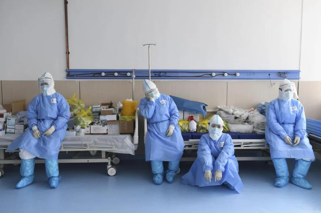 3月17日,湖北省黄冈市大别山区域医疗中心,整理完病房物资,打扫完卫生后,湖南医疗队队员们形态各异的在病房休息片刻,如释重负。