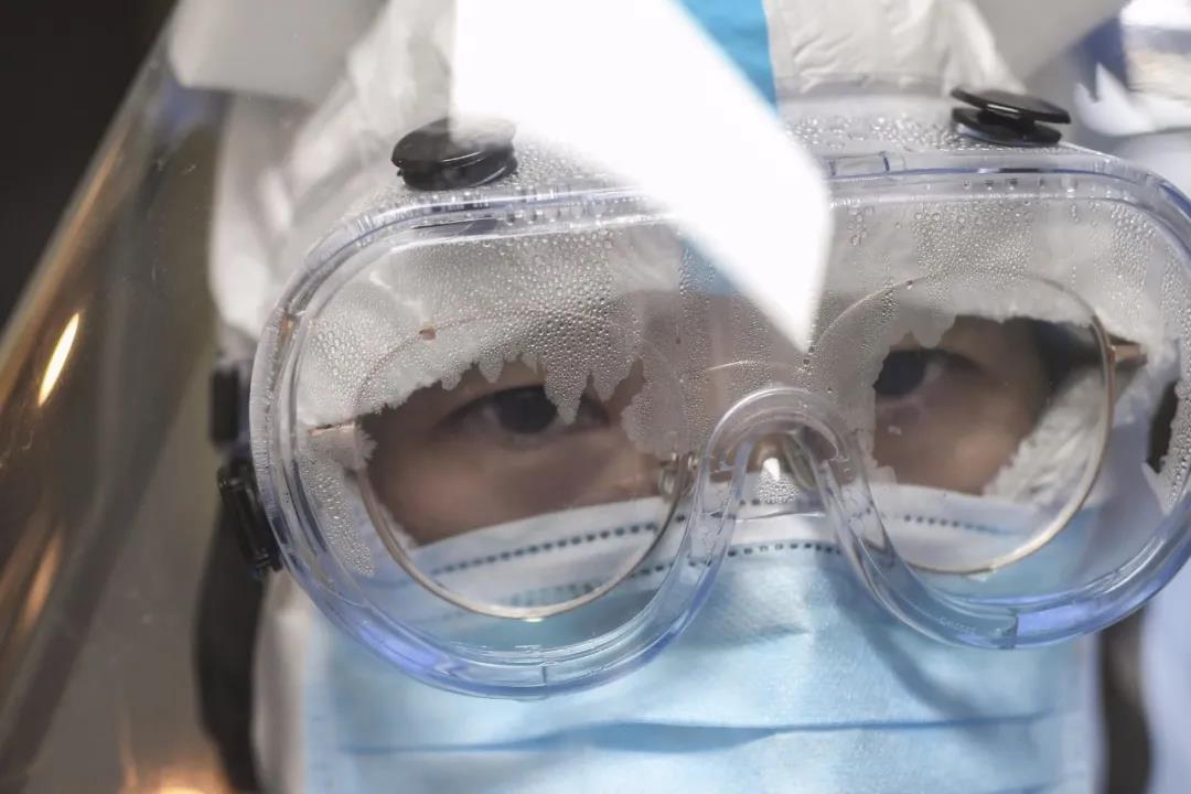 3月4日凌晨3时许,湖北省黄冈市大别山区域医疗中心,护士樊柯麟的护目镜被水雾笼罩。“最难的就是给病人打针,因为看不清楚,想要做到一针见血太难了!”樊柯麟说。