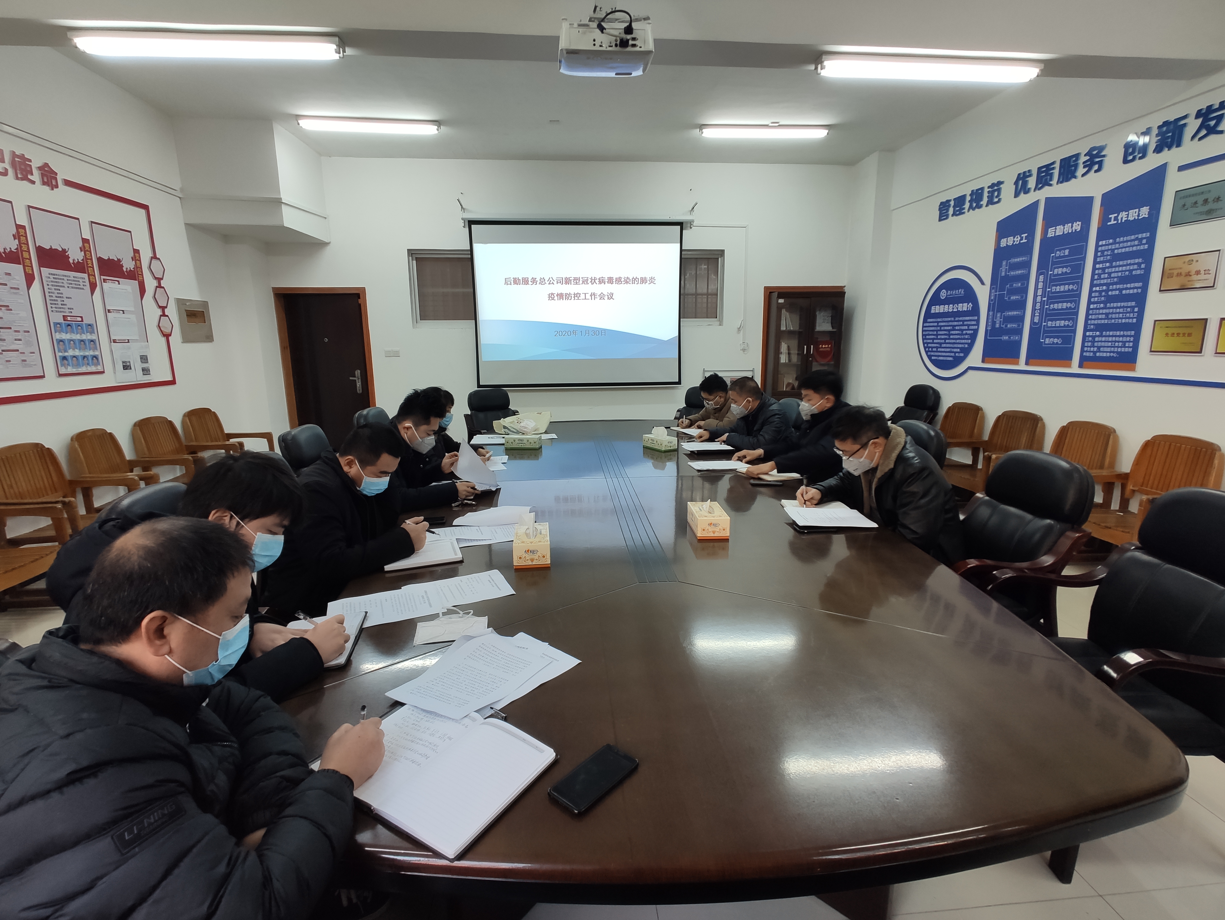 1月30日上午,后勤服务总公司迅速组织召开防控工作会议,传达教育部、省教育厅和学校防控工作会议精神。针对防控工作认真研判,成立后勤疫情防控工作领导小组,制定了《后勤服务总公司新型冠状病毒感染的肺炎疫情防控工作方案》。为确保各项工作落到实处,各中心细化制定了防控工作具体方案和周详的防控措施,密切关注疫情发展,坚持“日报告”“零报告”制度。