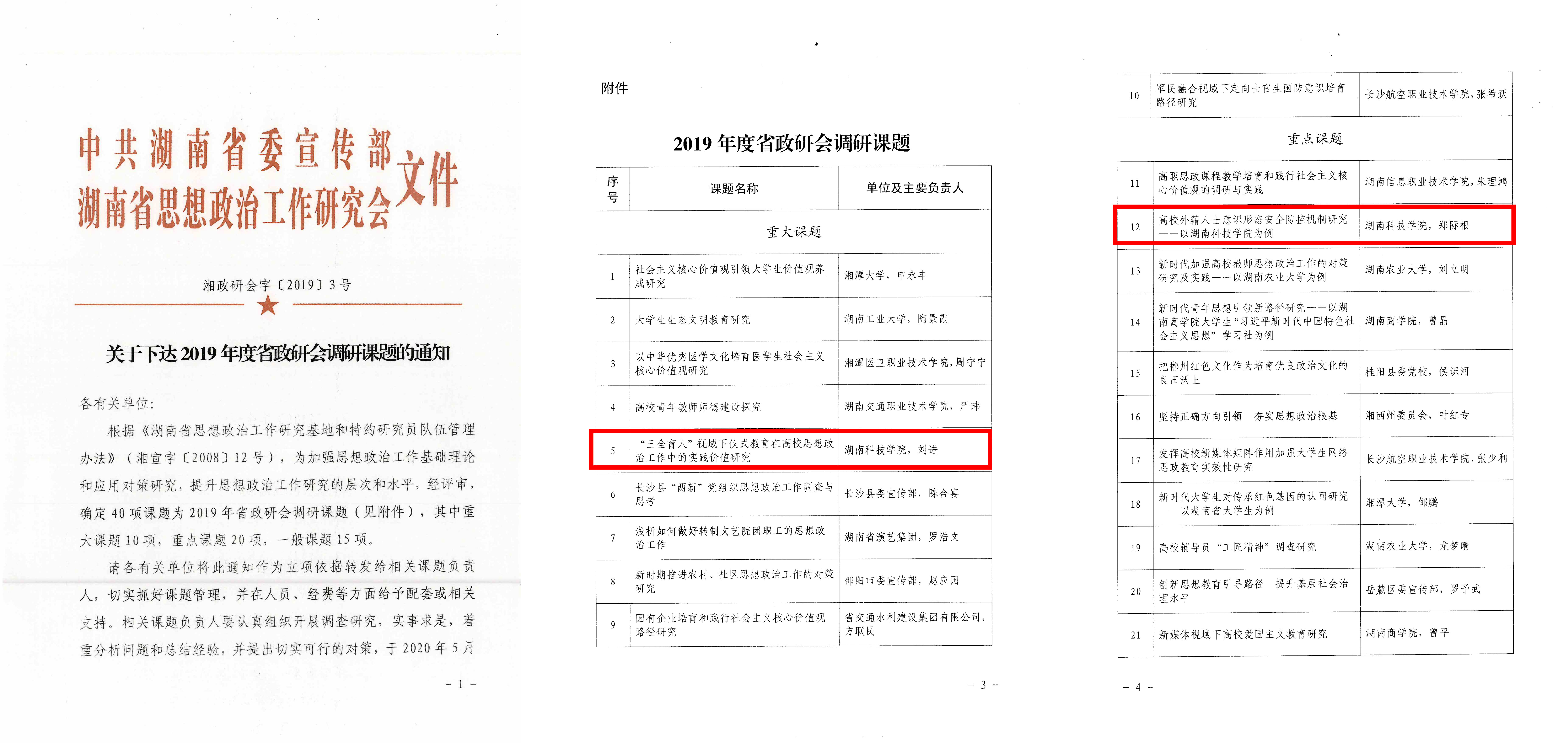 本网讯 12月23日,中共湖南省委宣传部、湖南省思想政治工作研究会发布《关于下达2019年度省政研会调研课题的通知》,我校旅游与文化产业学院教师刘进申报的《“三全育人”视域下仪式教育在高校思想政治工作中的实践价值研究》获重大课题立项,国际交流与合作处处长郑际根申报的《高校外籍人士意识形态安全防控机制研究——以开云最新版本app下载为例》获重点课题立项。